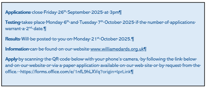 - 11th September 2025 - OPEN EVENING for year 6 students who are considering applying for a place for starting September 2026